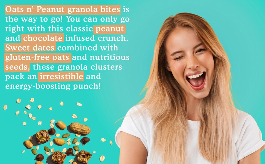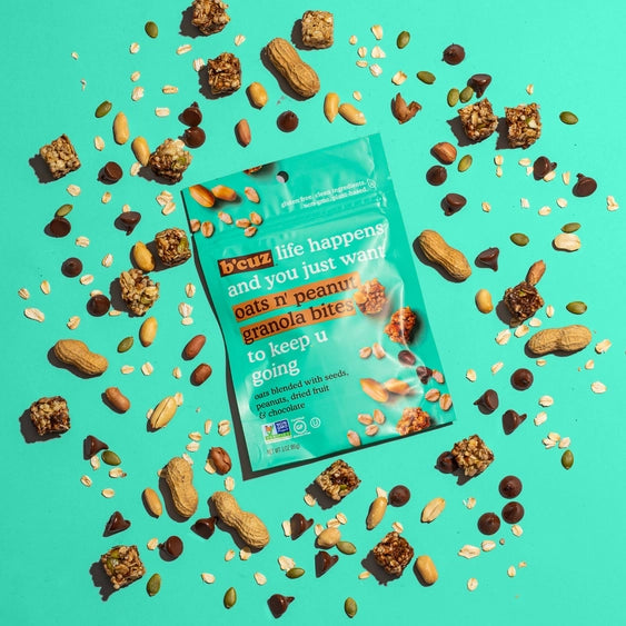 B'cuz it's delicious - Oats n’ Peanut Granola Bites are the boost you need! Enjoy this pack of granola bar bites made of oat clusters with classic peanut, chocolate, dates, and seeds for a sweet, chewy crunch. Great for breakfast and all-day snacking. Healthy snacks for adults and yummy snacks for kids!