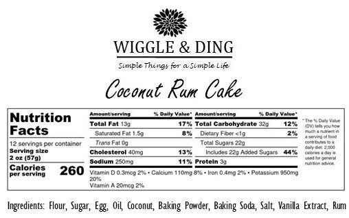 Coconut Rum Cake - Ingredients: coconut rum, Himalayan salt, baking soda, baking powder, vegetable oil, eggs, pecans, vanilla extract, flour, sweet cream butter, water, sugar