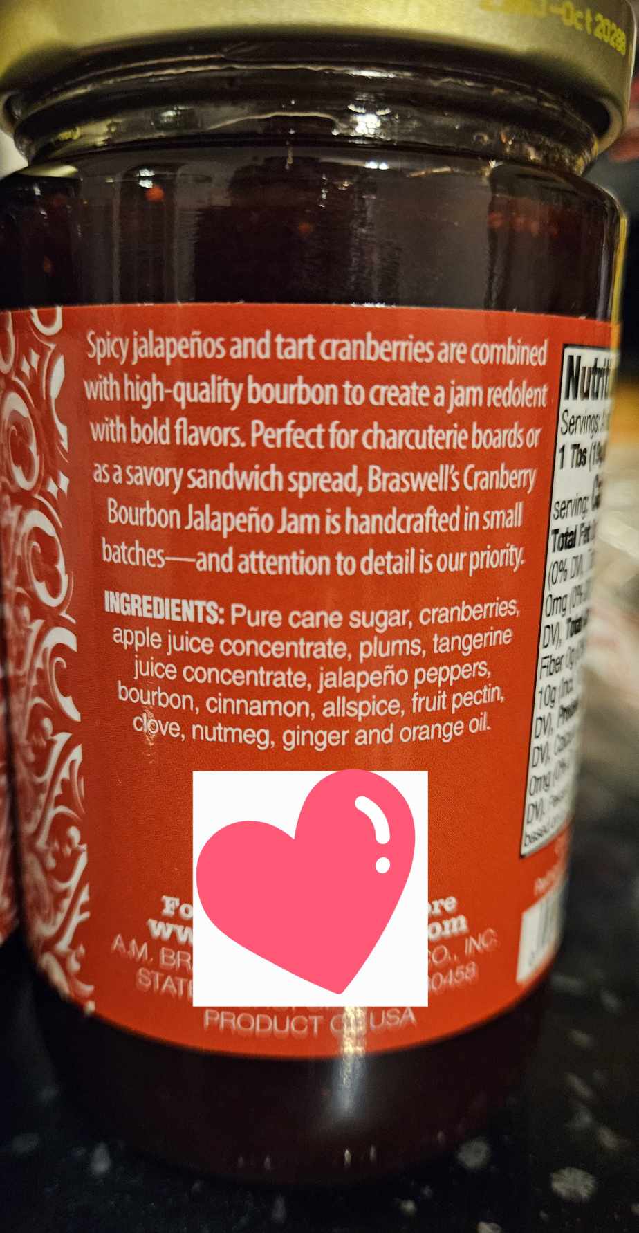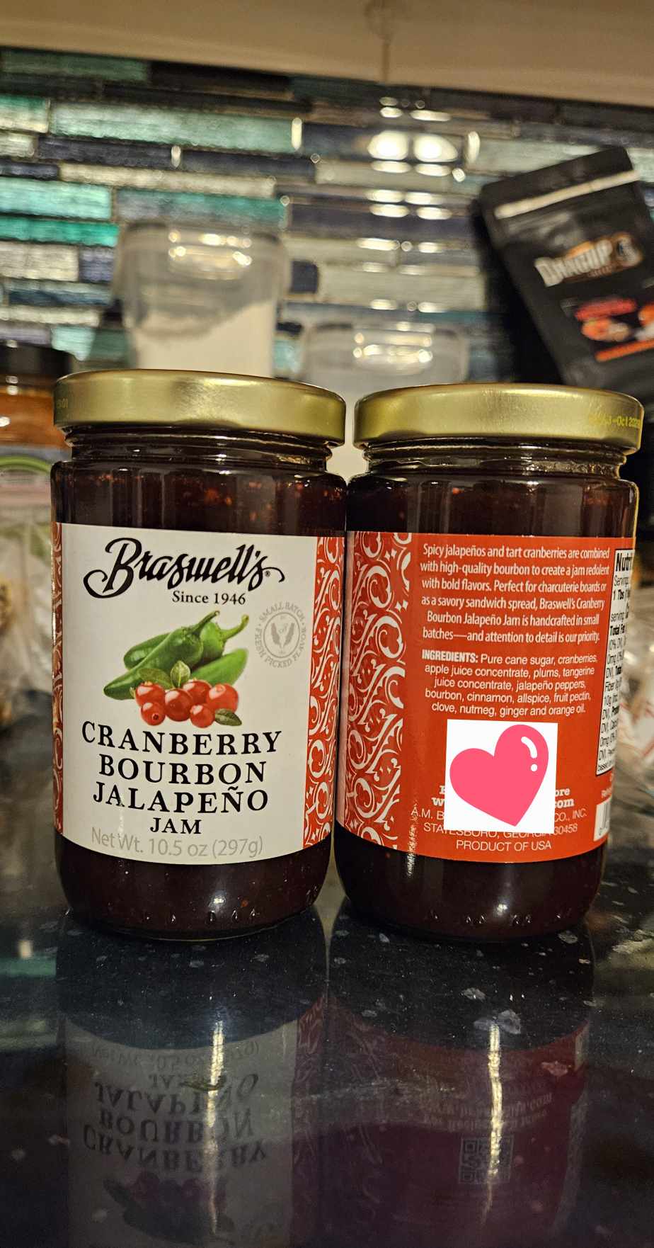 Spicy jalapenos and tart cherries are combined with high-quality bourbon to create a jam with bold flavors. Perfect for charcuterie boards or as a savory sandwich spread Braswell's Cranberry Bourbon Jalapeno Jam is handcrafted in small batches and attention to detail is our priority!
