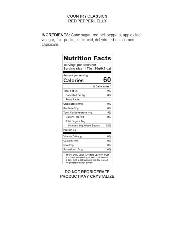 INGREDIENTS: Cane sugar, red bell peppers, apple cider vinegar, pectin, citric acid, dehydrated onions, and capsicum.