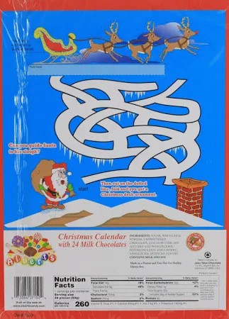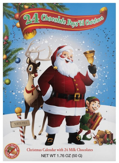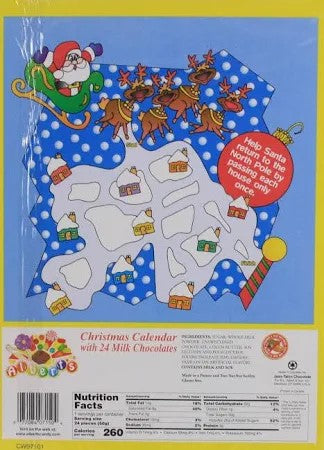 Christmas Countdown Calendars featuring fun, festive Christmas scenes. Each calendar has fun cut-out activities on the back. Each calendar is filled with 24 milk chocolates.