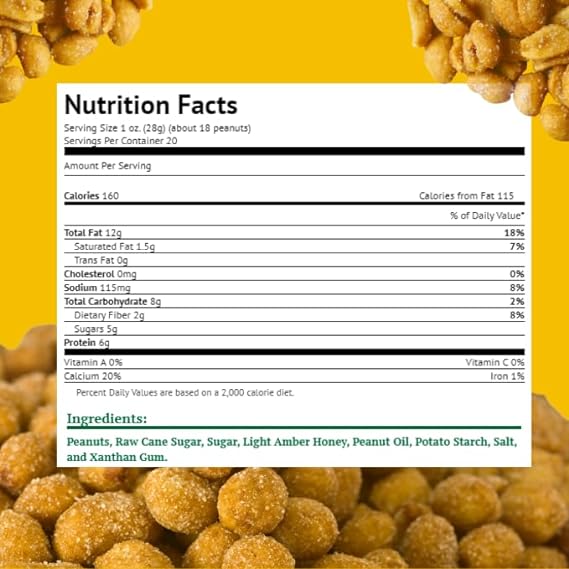 PERFECTLY BALANCE SWEETNESS—Our peanuts' LIGHT HONEY GLAZE strikes the perfect balance between sweet and savory. Unlike overly sweetened peanuts, our light honey coating enhances the nuts' natural flavors without overpowering them. You'll find just the right amount of sweetness, making these peanuts a guilt-free treat. Satisfy your sweet cravings with a blend of honey and peanuts.