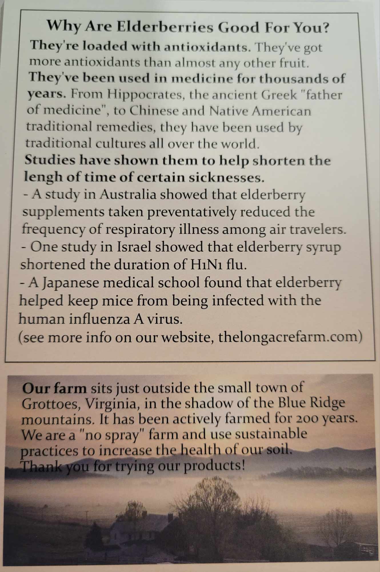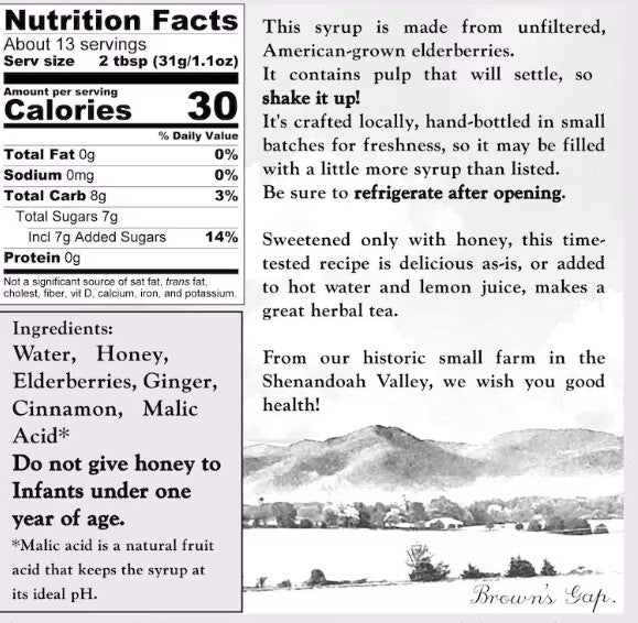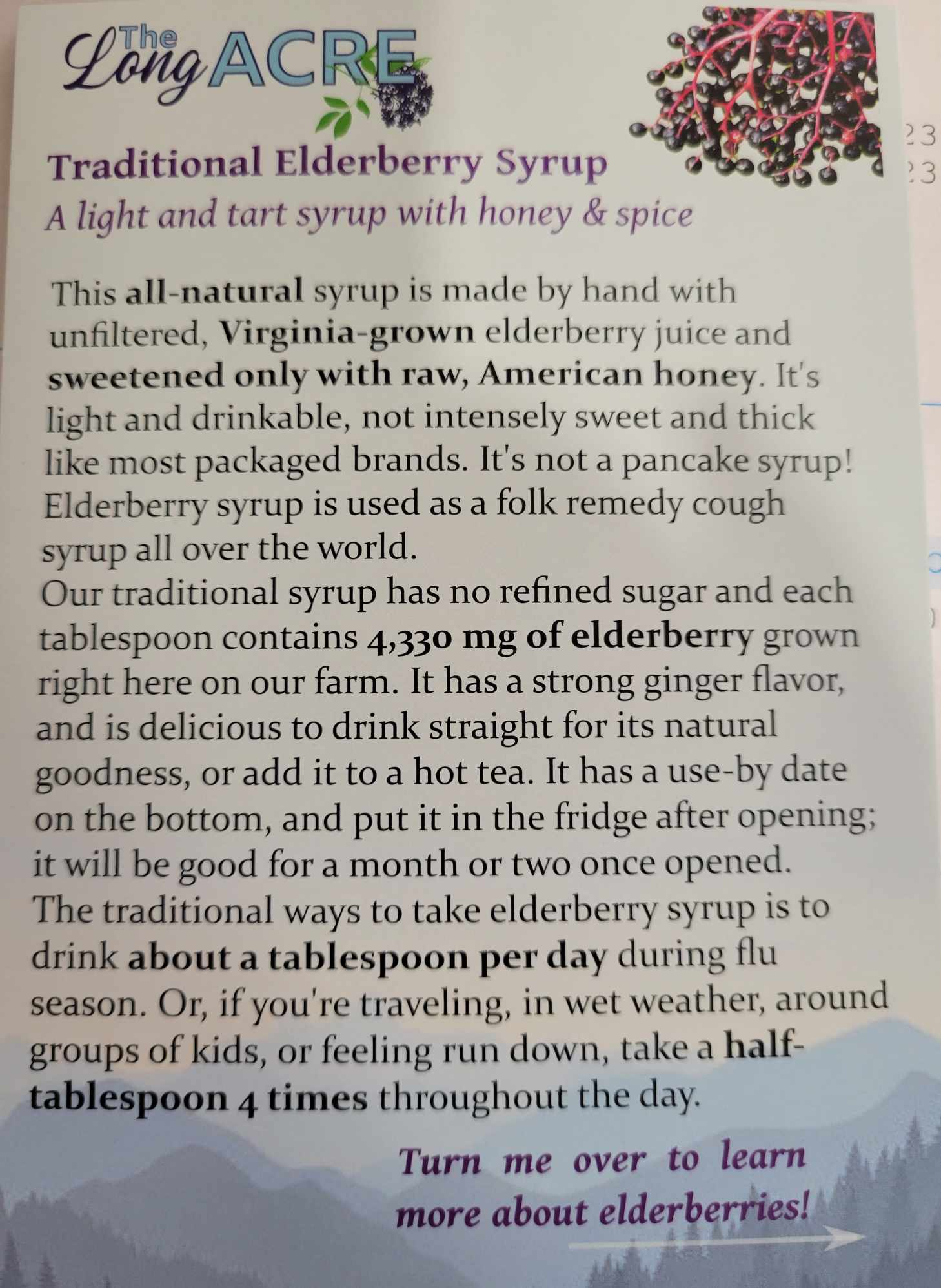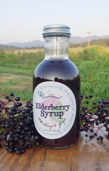 A traditional elderberry syrup made with berries grown on our farm. This syrup is sweetened only with raw American honey and contains the juice and pulp of about 1/4 lb. of berries.