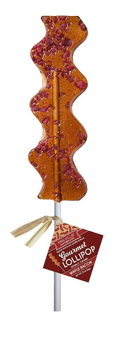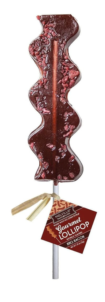 Melville Gourmet bacon lollipops are hard candy lollipops infused with bacon bits and available in maple, honey, and BBQ bacon. They are hand-poured to order, and slight variations may occur.