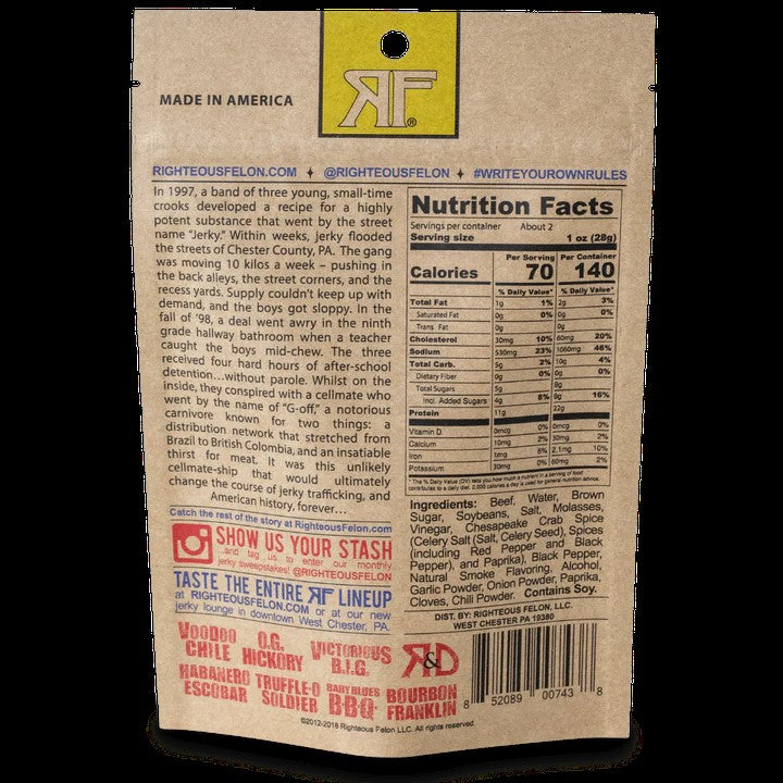 Righteous Felon's newest addition is loaded with hickory smoke and a touch of Old Bay styled Chesapeake crab spice for a delicious jerky in crab cake mode.