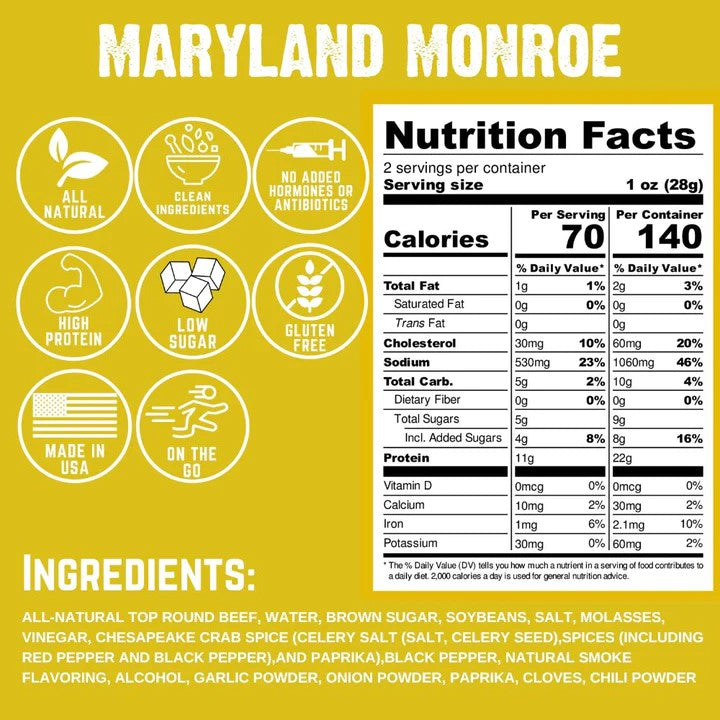 Ingredients: Beef, water, brown sugar, soybeans, salt, molasses, vinegar, Chesapeake crab spice (celery salt (salt, celery seed), spices (including red pepper and black pepper), and paprika), black pepper, natural smoke flavoring, alcohol, garlic powder, onion powder, paprika, cloves, chili powder.