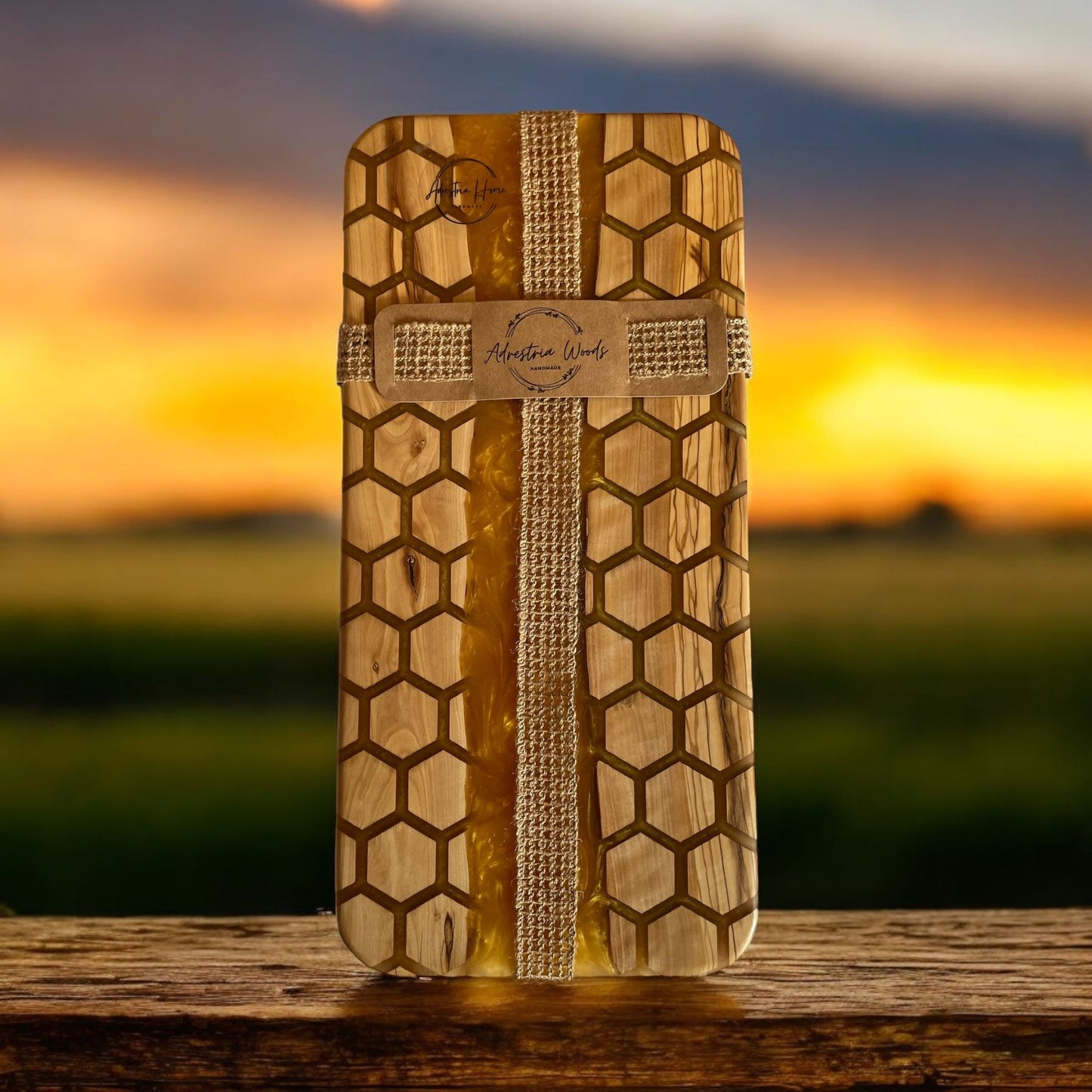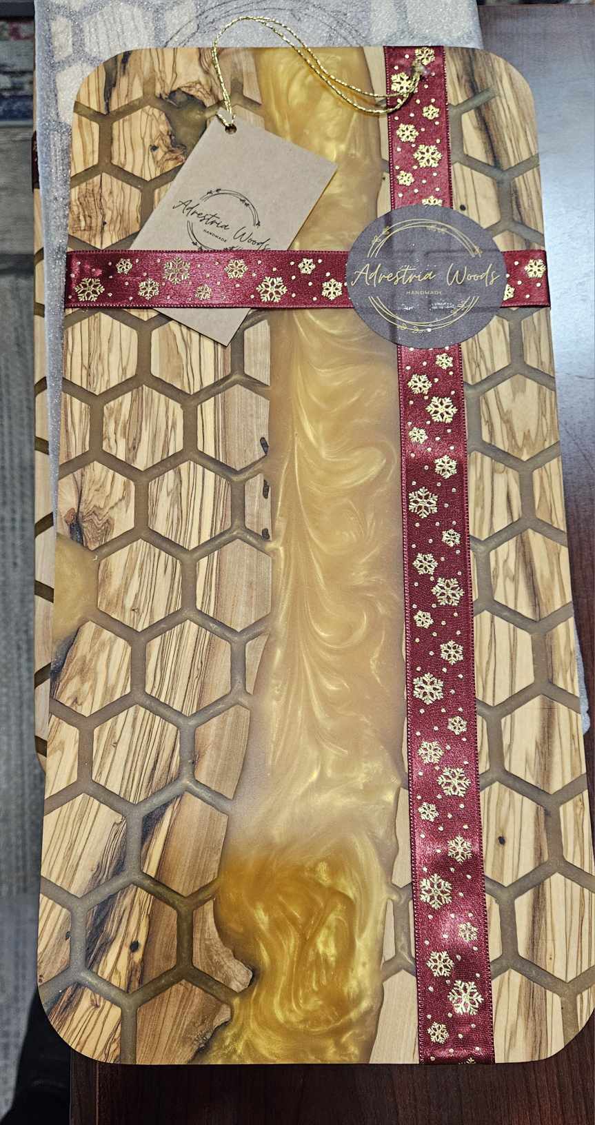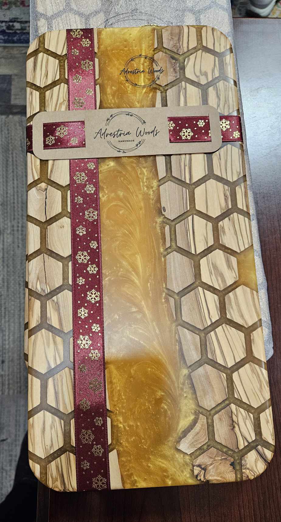 - Design: Unique honeycomb pattern with a flowing golden resin river.
